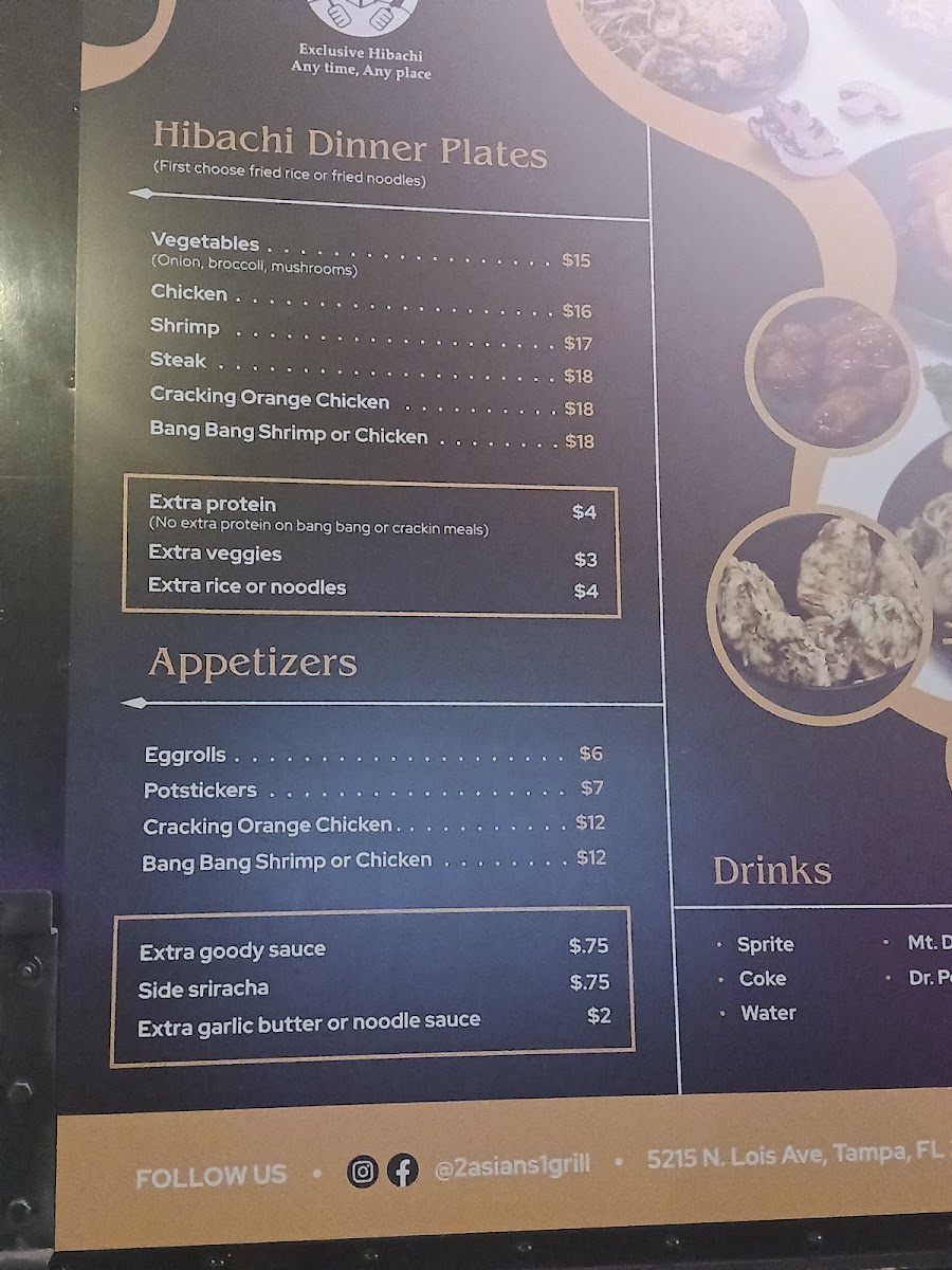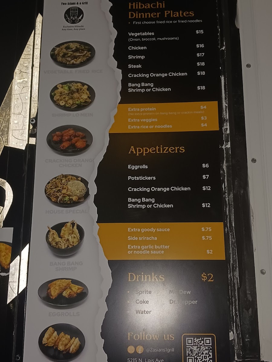 The menu at Two Asians And A Grill offers a delightful variety of hibachi dinner plates, perfect for any craving. Guests can enjoy the Vegetables hibachi plate for a lighter option, or go for the hearty Chicken, Shrimp, or Steak hibachi plates. For something a bit more unique, the Cracking Orange Chicken provides a flavorful twist. To start off the meal, customers can choose from classic Eggrolls or Potstickers, each adding a crispy, savory bite to the experience. For an extra kick, the Extra Goody Sauce is a popular add-on. The drink selection includes refreshing options like Sprite, Coke, Water, Mt. Dew, and Dr. Pepper, ensuring something for every taste. The menu at Two Asians And A Grill balances variety and bold flavors, making it a satisfying destination for both casual meals and a more indulgent dining experience.